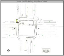 This collision provides a clear example of a slide-to-stop event with overlapping tire marks from the front and rear tires. The green van attempted to make a left turn across the path of an oncoming white pickup truck but was unable to complete the maneuver. In response, the driver of the pickup truck applied heavy braking in an effort to avoid the collision, producing the documented skid marks.