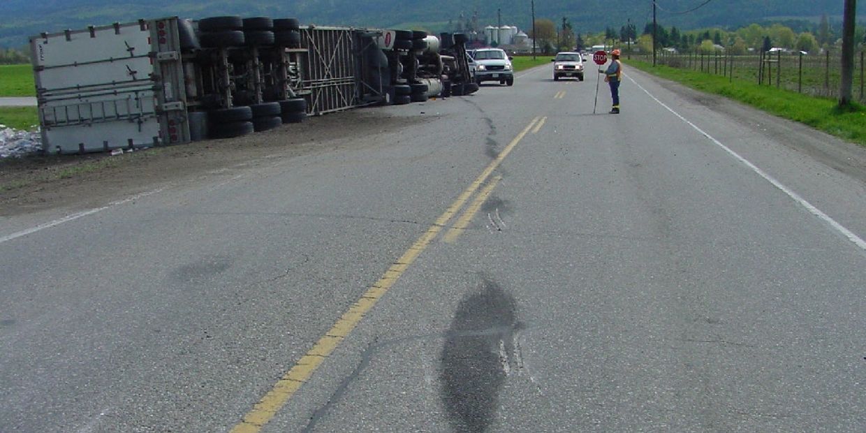 This collision involved a concrete truck that rolled over while negotiating a sharp curve in Kelowna. Distinct tire marks documented during the rollover sequence, along with impact marks created after the vehicle came to rest on its left side, provided critical evidence for analysis.